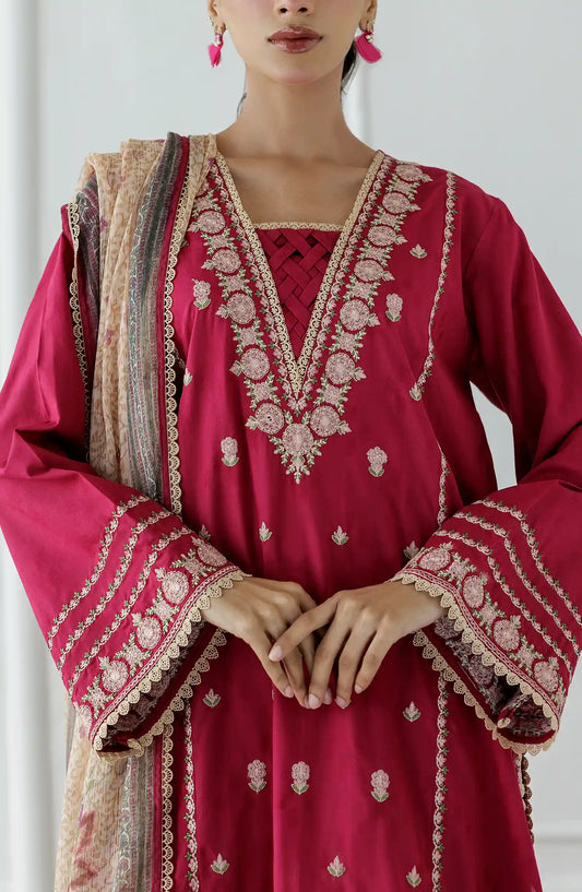 Description: Festive luxury 3 piece set featuring a deep maroon lawn shirt with intricate embroidery, round neckline, and full sleeves. Paired with cambric trousers and a delicately embroidered Thai silk dupatta for timeless elegance.