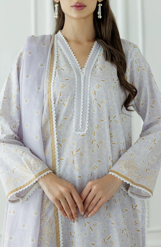 This summer lawn 2-piece co-ord set features a lilac printed kurta with lace accents and matching printed trousers. A breezy, chic look perfect for casual elegance all season long.