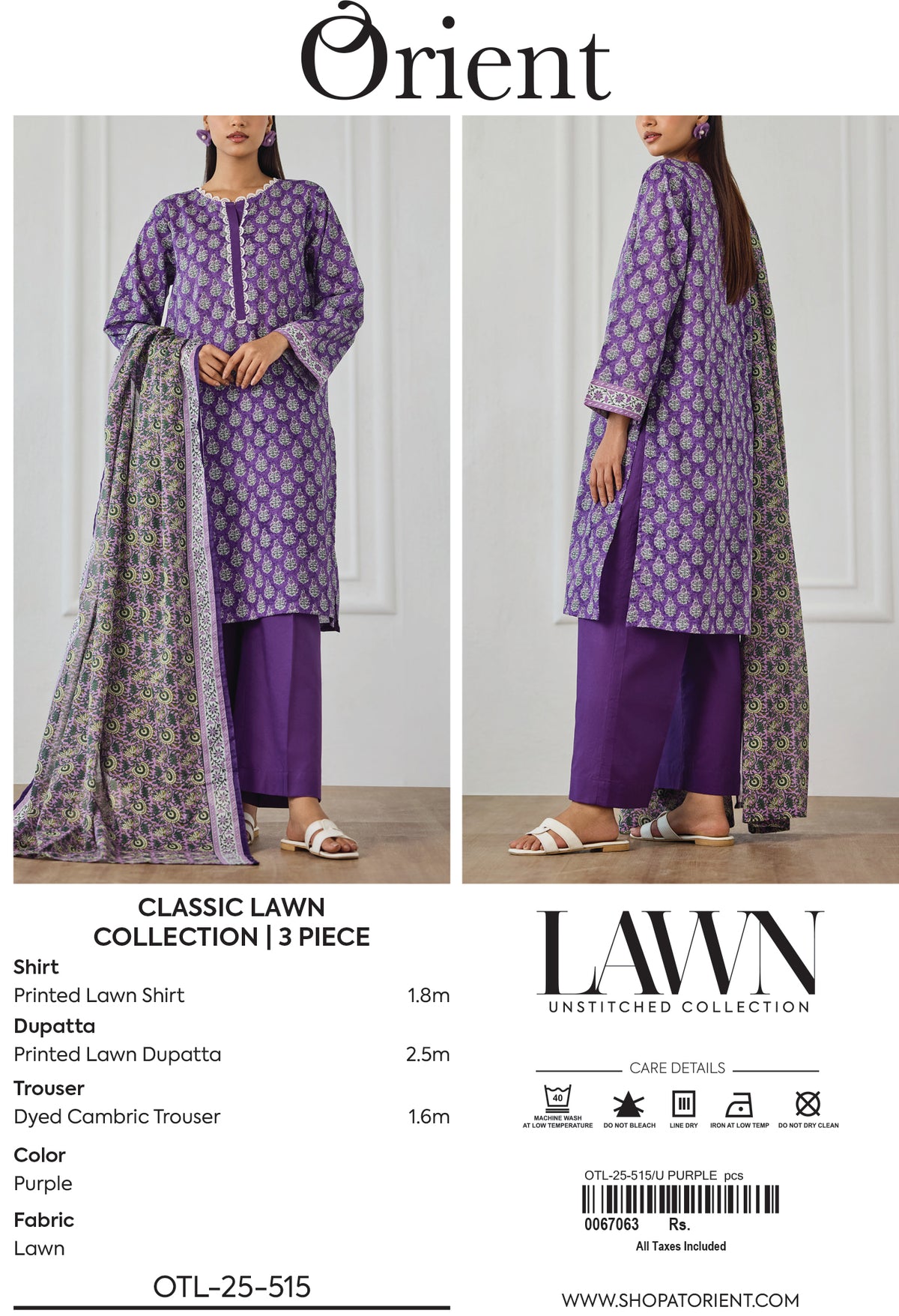 Unstitched | 3 Piece | Printed | Lawn Shirt | OTL-25-515/U PURPLE