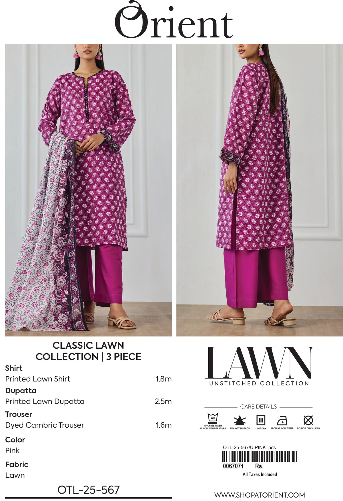 Unstitched | 3 Piece | Printed | Lawn Shirt | OTL-25-567/U PINK