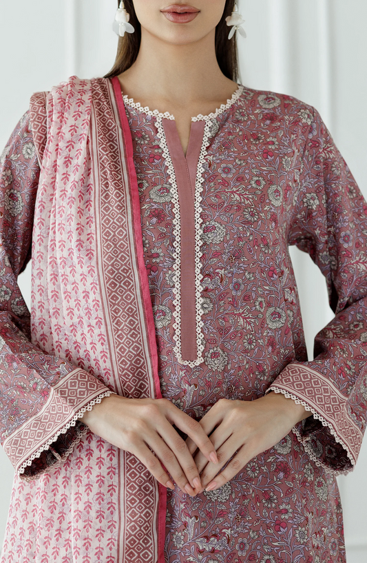 A refreshing summer lawn 3-piece suit featuring a soft pink printed kurta with V-neckline, vibrant matching trousers, and a flowy textured dupatta. ideal for everyday elegance and comfort.