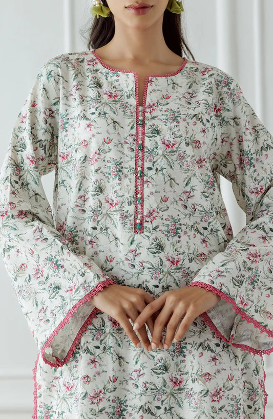Woman wearing a floral outfit with a gray base shirt & trouser. Stitched Printed Lawn Shirt & Pant - 2 Piece Suits (Co-ord Set) - WRCV25S-2016
