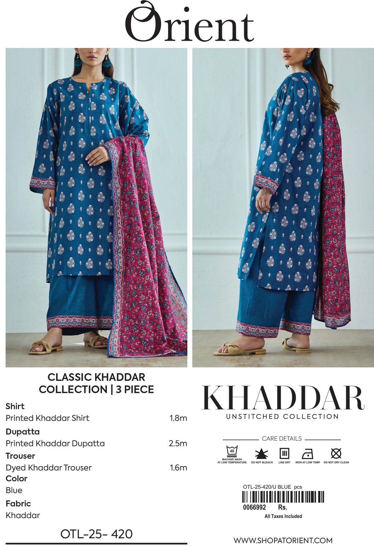 Unstitched | 3 Piece | Printed | Khaddar Shirt | OTL-25-420/U BLUE