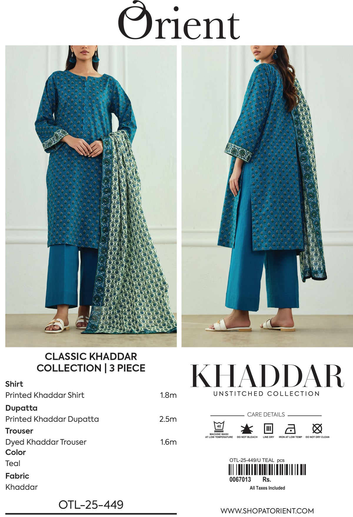 Unstitched | 3 Piece | Printed | Khaddar Shirt | OTL-25-449/U TEAL