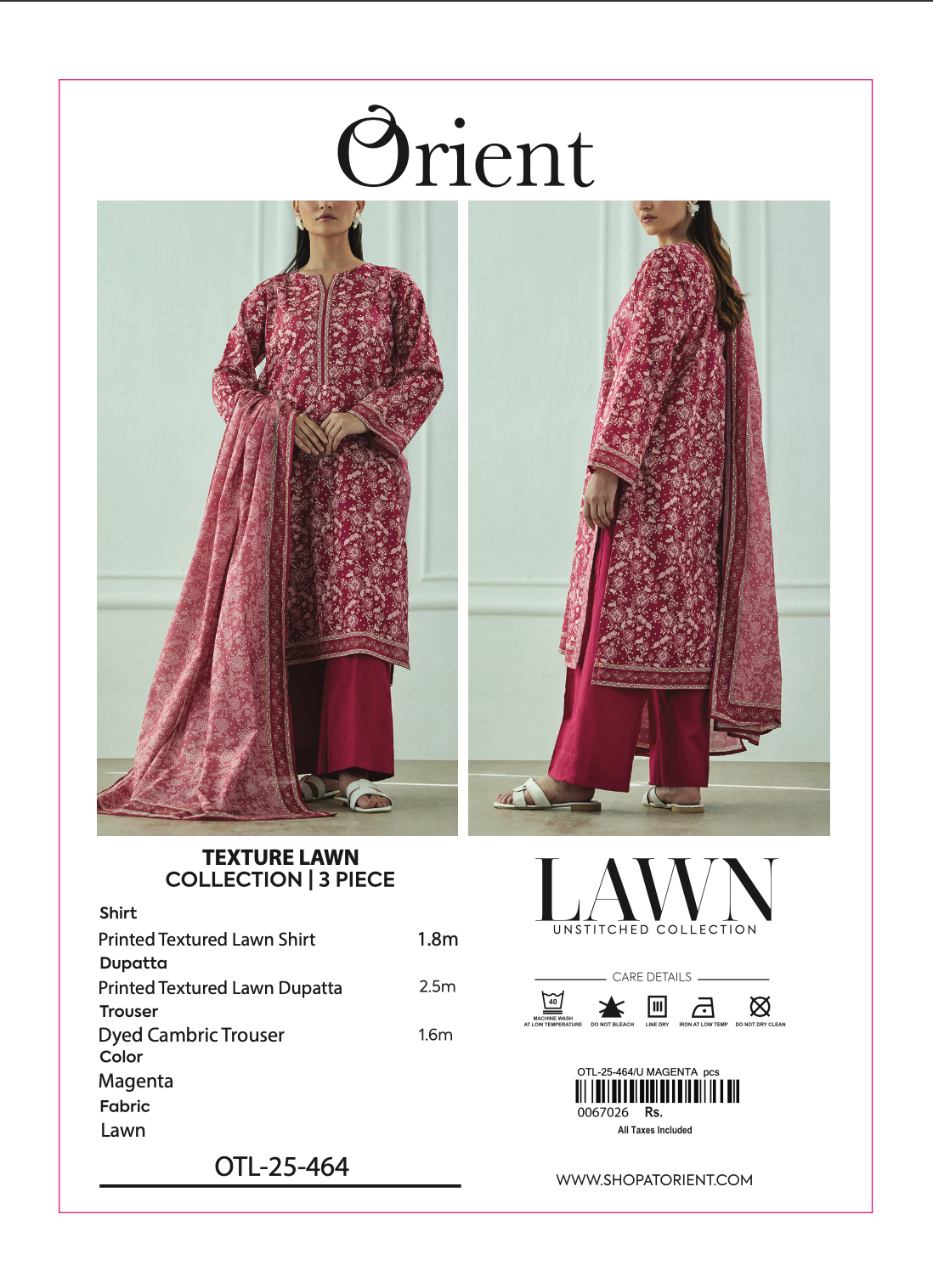 Unstitched | 3 Piece | Printed | Texture Lawn Shirt | OTL-25-464/U MAGENTA
