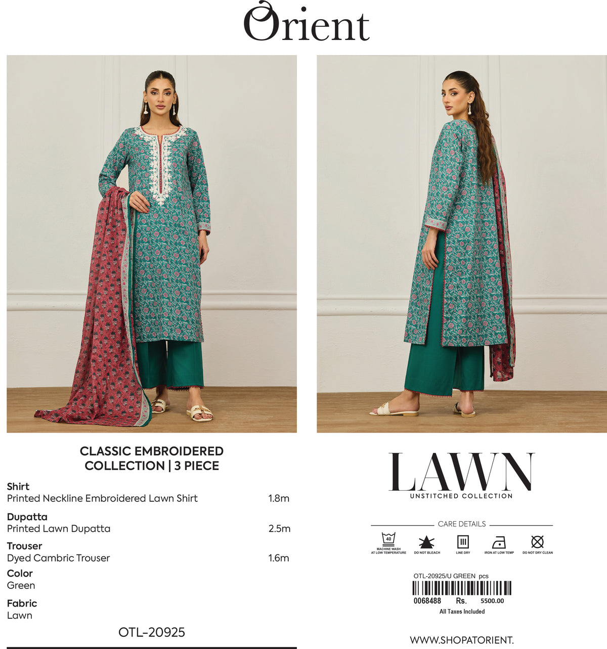 Unstitched | 3 Piece | Embroidered | Lawn Shirt | OTL-20925/U GREEN