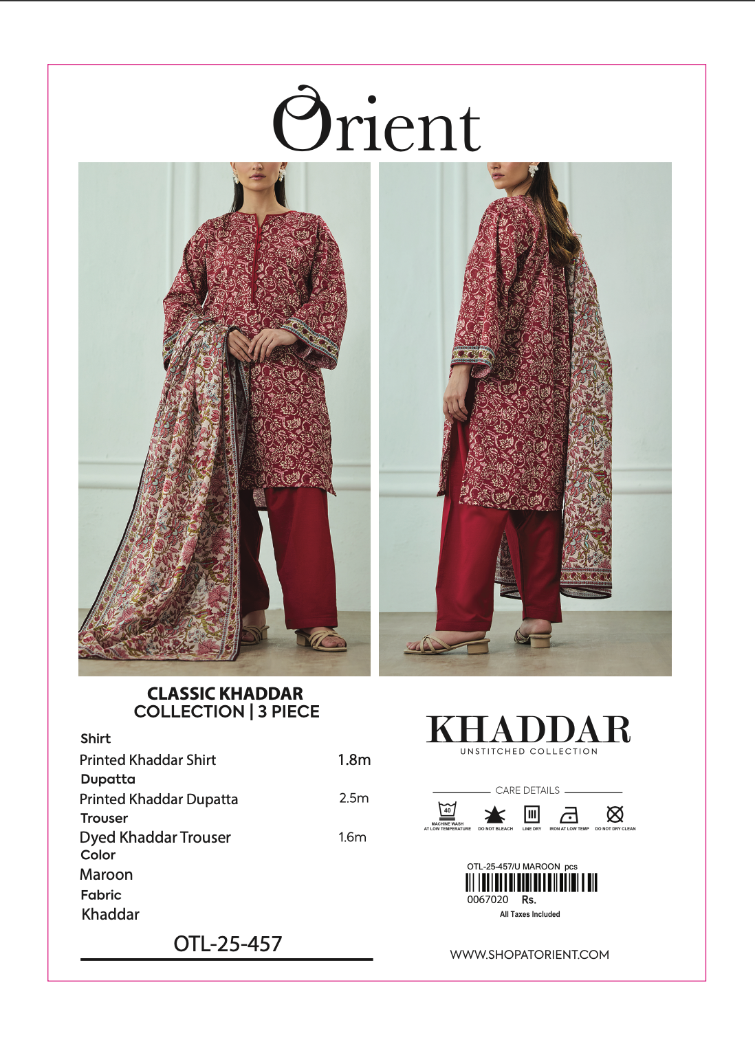 Unstitched | 3 Piece | Printed | Khaddar Shirt | OTL-25-457/U MAROON