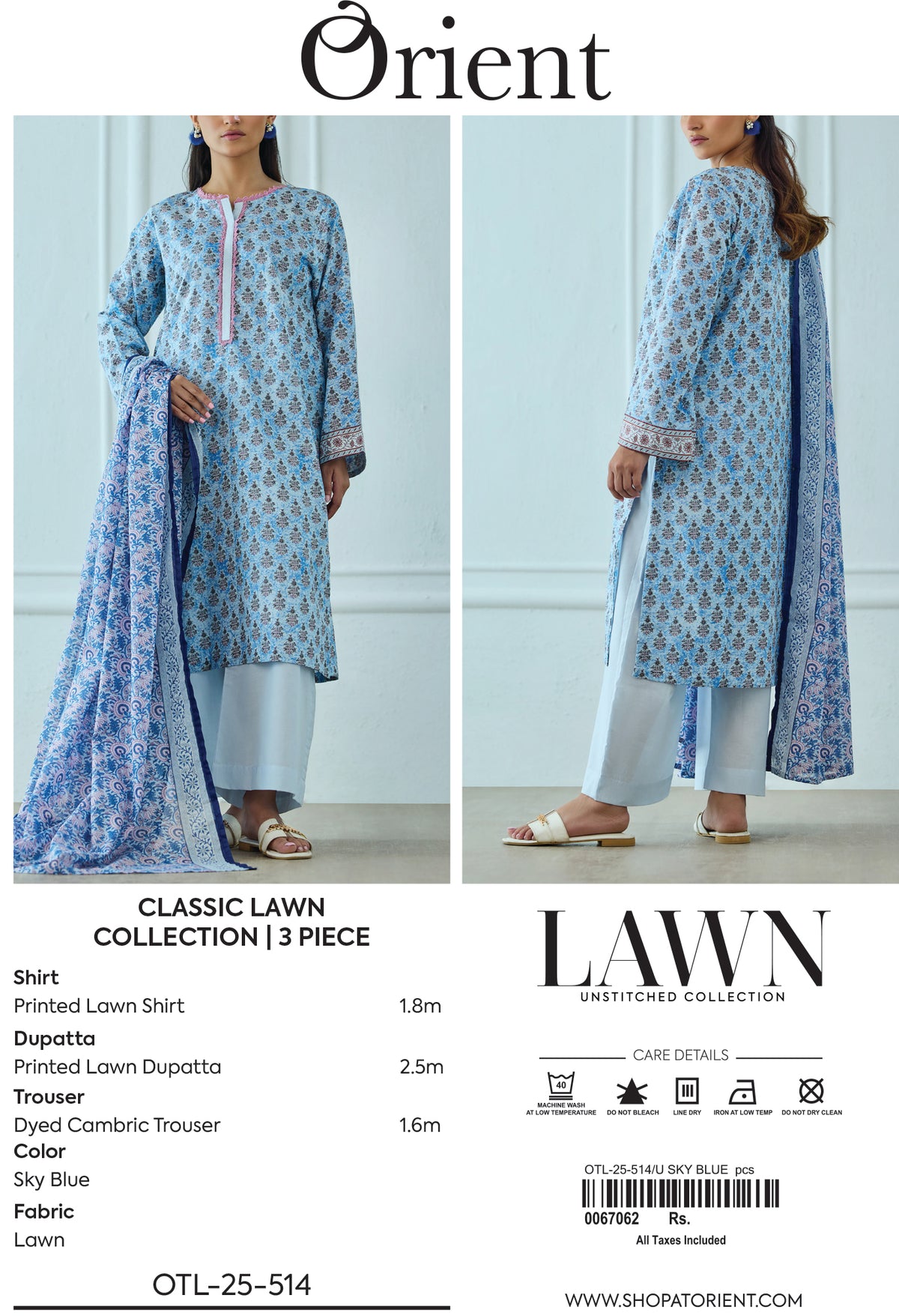 Unstitched | 3 Piece | Printed | Lawn Shirt | OTL-25-514/U SKY BLUE
