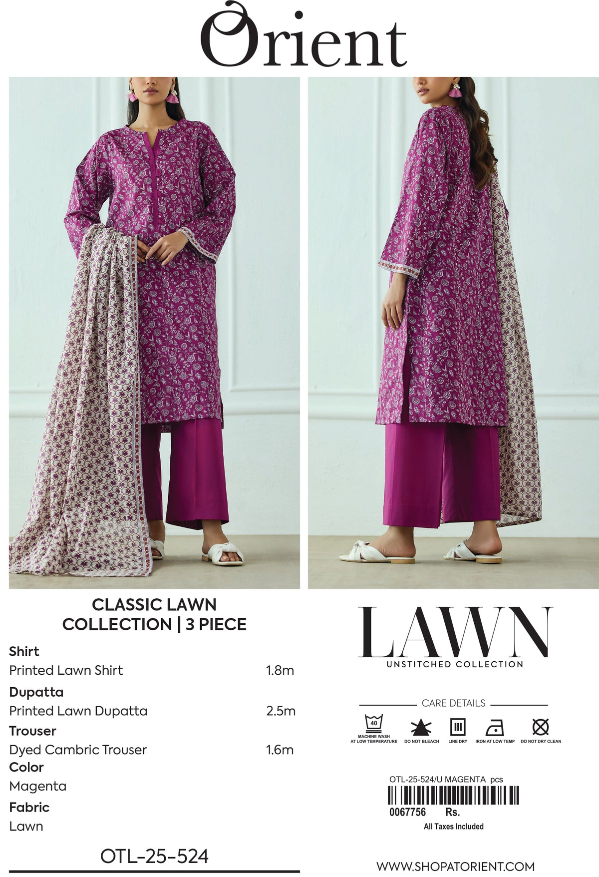 Unstitched | 3 Piece | Printed | Lawn Shirt | OTL-25-524/U MAGENTA